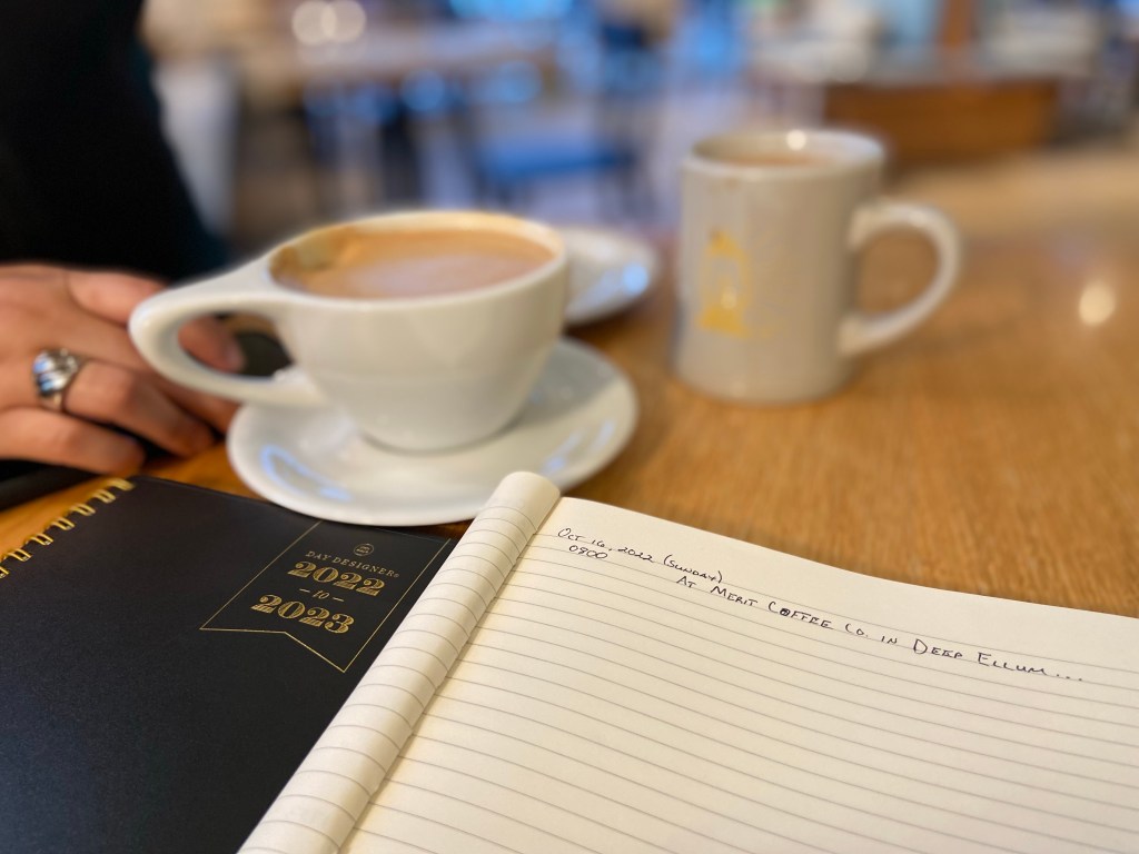 Tapping on the widows of Merit Coffee Co. in Deep Ellum was the rain of a season changing, it won’t be long now before we feel the death of winter – not that I mind the cold; I might actually prefer it. And how appropriate the change considering where I am in my life. The setting is just right for inspiration. What better place to be than next to my wife, not to mention the coffee.