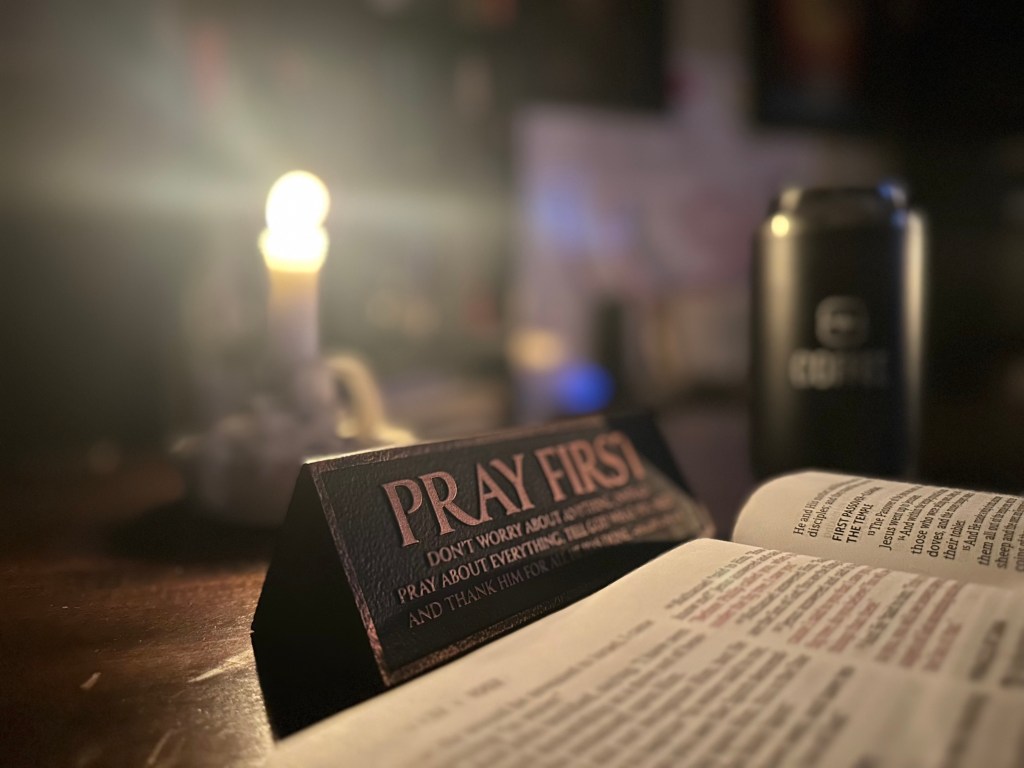 There’s a table with caster wheels—ready to move, yet for now it rests, stationed beside the chair where I sit in prayer. A candle burns low, pushing back the dark. Beside it, my open Bible lies in the glow. Next to it—a Watermark Community Church coffee cup, a gift from a dear brother, friend, and colleague. And then, a small sign that simply reads: “Pray First.”