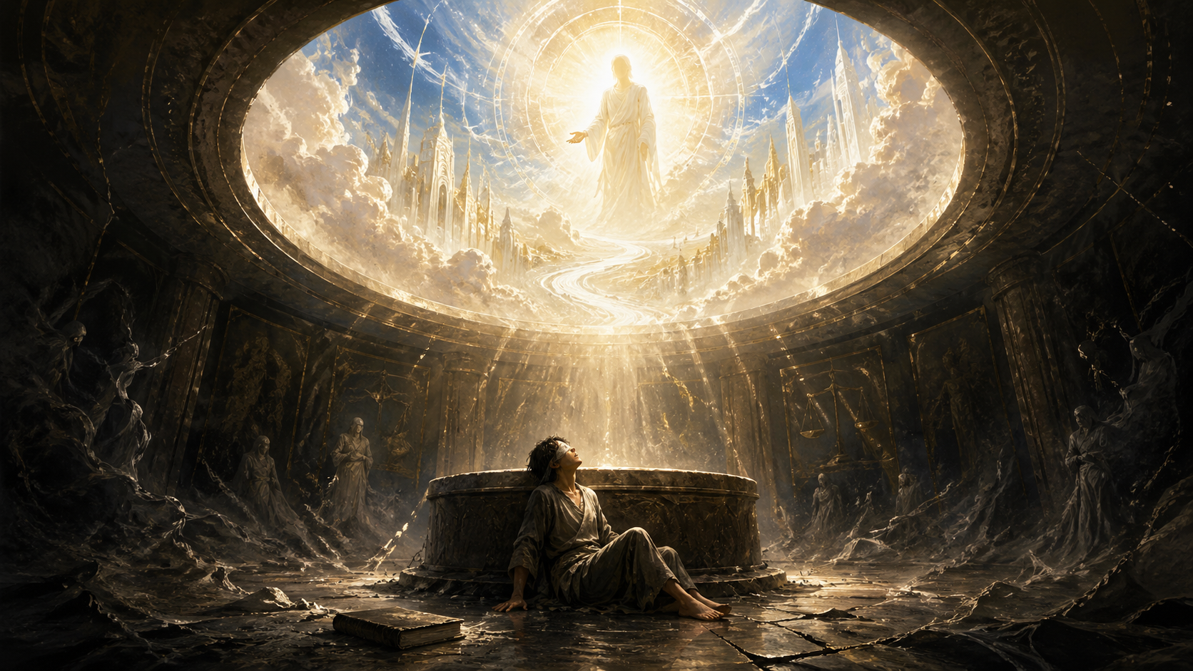 Then light floods your eyes; you wake up on the ground next to the podium, still in the chamber, but through the lens of the ceiling, you see the glory of heaven and the Helper. The Helper then says, “Come and see.“